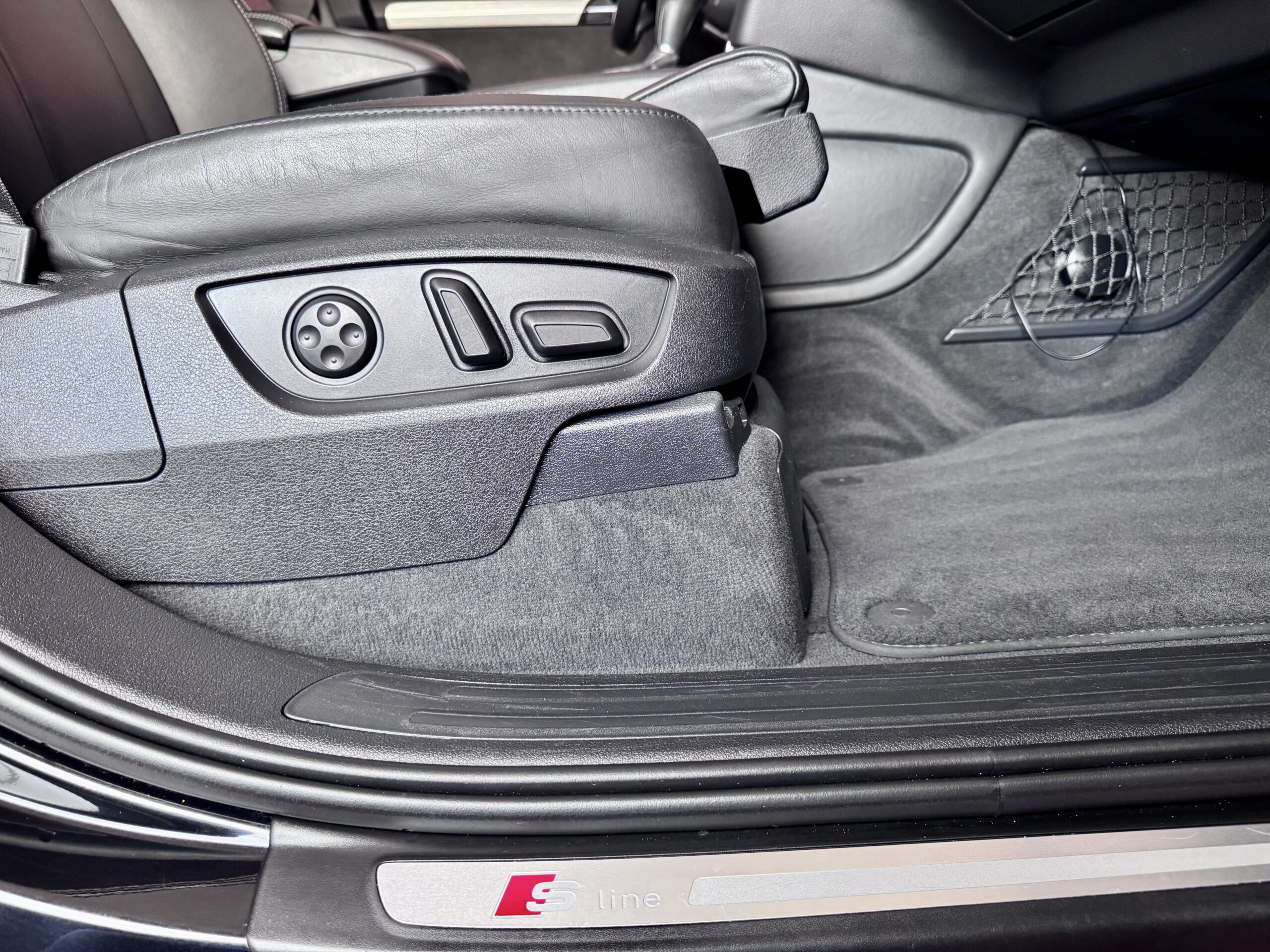 • Lederausstattung Verano Schwarz mit S line Logo-Prägung in Vordersitzlehnen